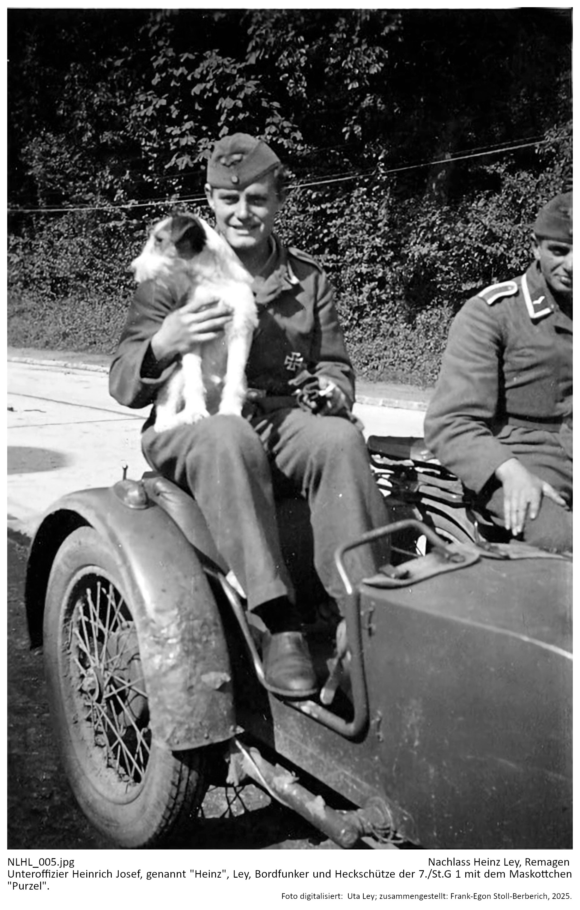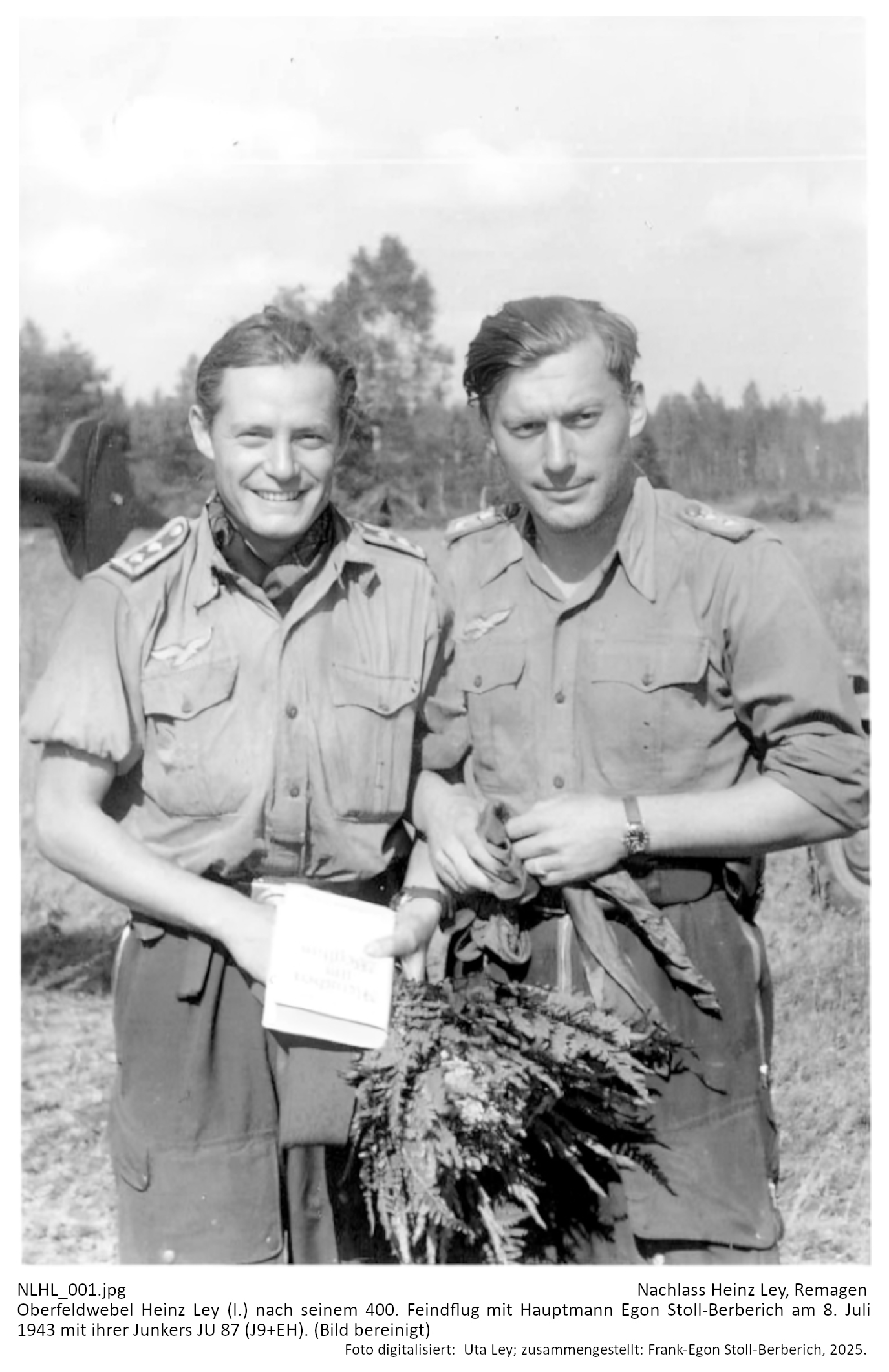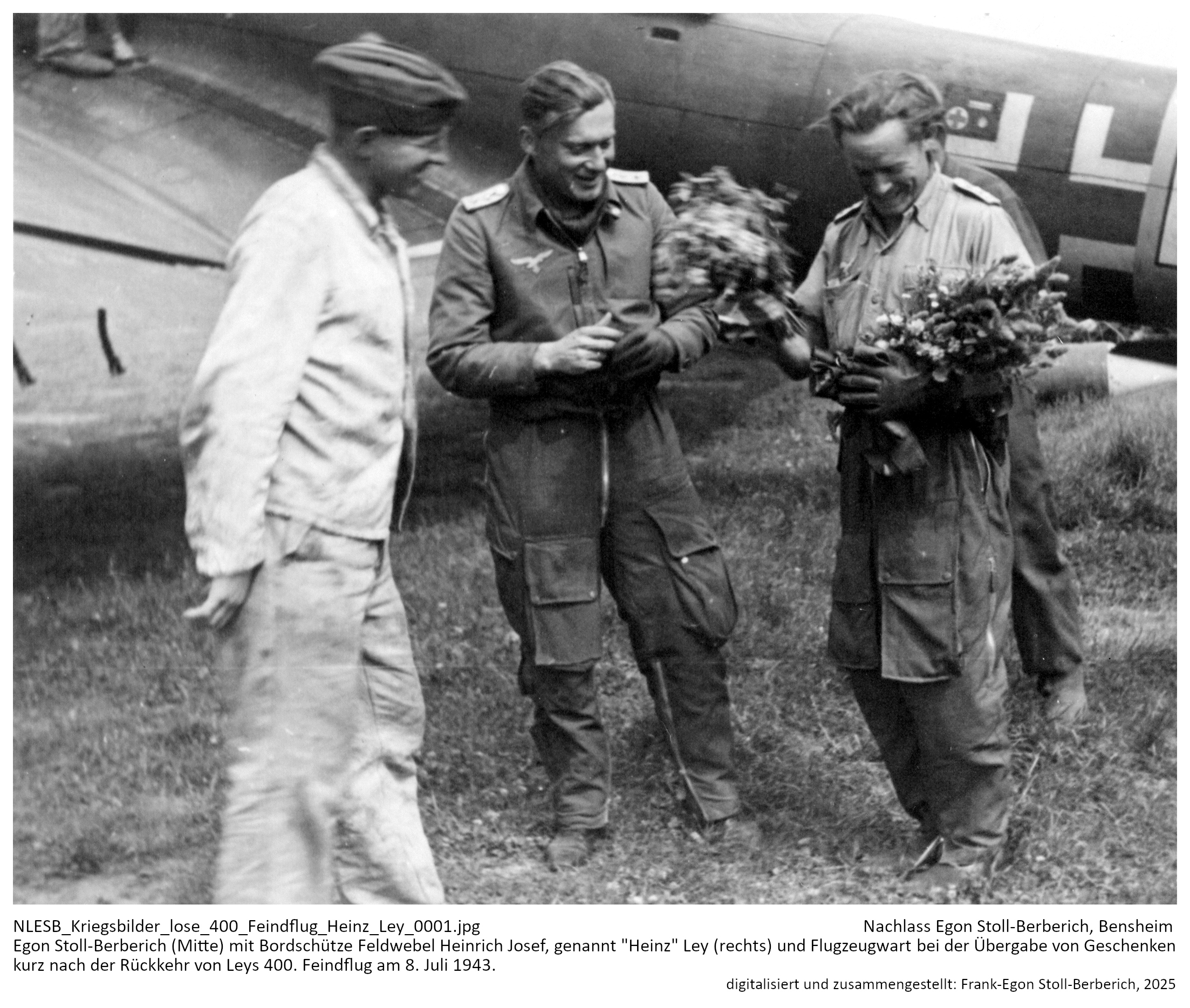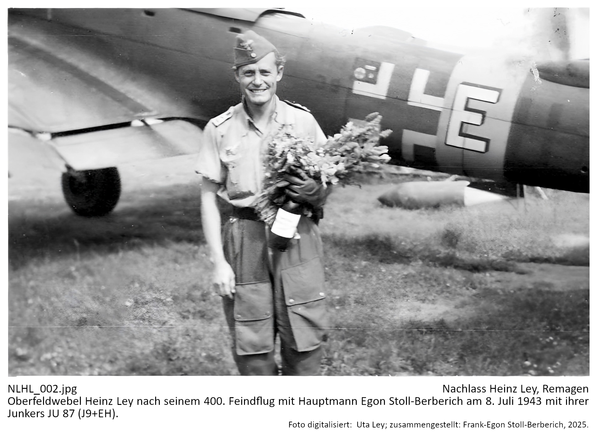 Egon Stoll-Berberichs Bordfunker und somit überlebenswichtiger Heckschütze, Oberfeldwebel Heinrich Josef, genannt "Heinz", Ley, ist in Egon Stoll-Berberichs Nachlass nur auf einer einzigen Aufnahme abgebildet, obwohl sein Name auch nach dem Krieg noch oft in Gesprächen fiel. Über ihn war leider lange Zeit nichts Weiteres bekannt. Vermutlich trennten sich die Wege dieser Besatzung, als die Sturzkampfgeschwader mit Junkers JU 87 zu Schlachtgeschwadern mit Focke-Wulf FW 190 umgewandelt wurden. Somit entfiel der rückwärtige Mann und die beiden verloren sich aus den Augen.
