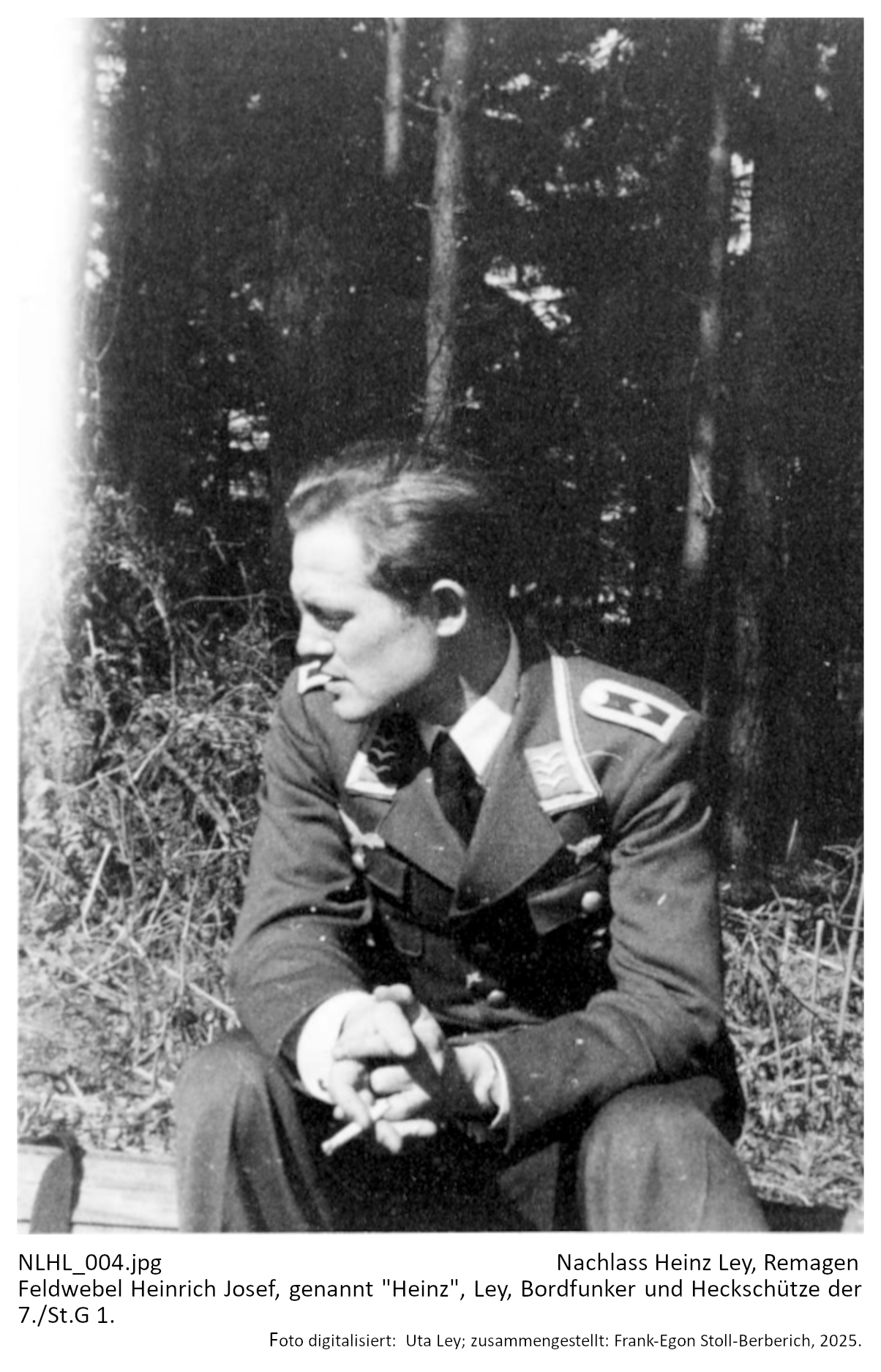 Egon Stoll-Berberichs Bordfunker und somit überlebenswichtiger Heckschütze, Oberfeldwebel Heinrich Josef, genannt "Heinz", Ley, ist in Egon Stoll-Berberichs Nachlass nur auf einer einzigen Aufnahme abgebildet, obwohl sein Name auch nach dem Krieg noch oft in Gesprächen fiel. Über ihn war leider lange Zeit nichts Weiteres bekannt. Vermutlich trennten sich die Wege dieser Besatzung, als die Sturzkampfgeschwader mit Junkers JU 87 zu Schlachtgeschwadern mit Focke-Wulf FW 190 umgewandelt wurden. Somit entfiel der rückwärtige Mann und die beiden verloren sich aus den Augen.